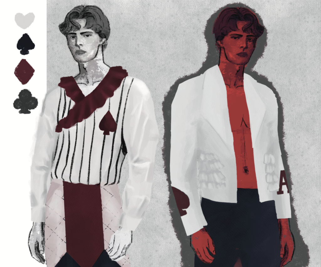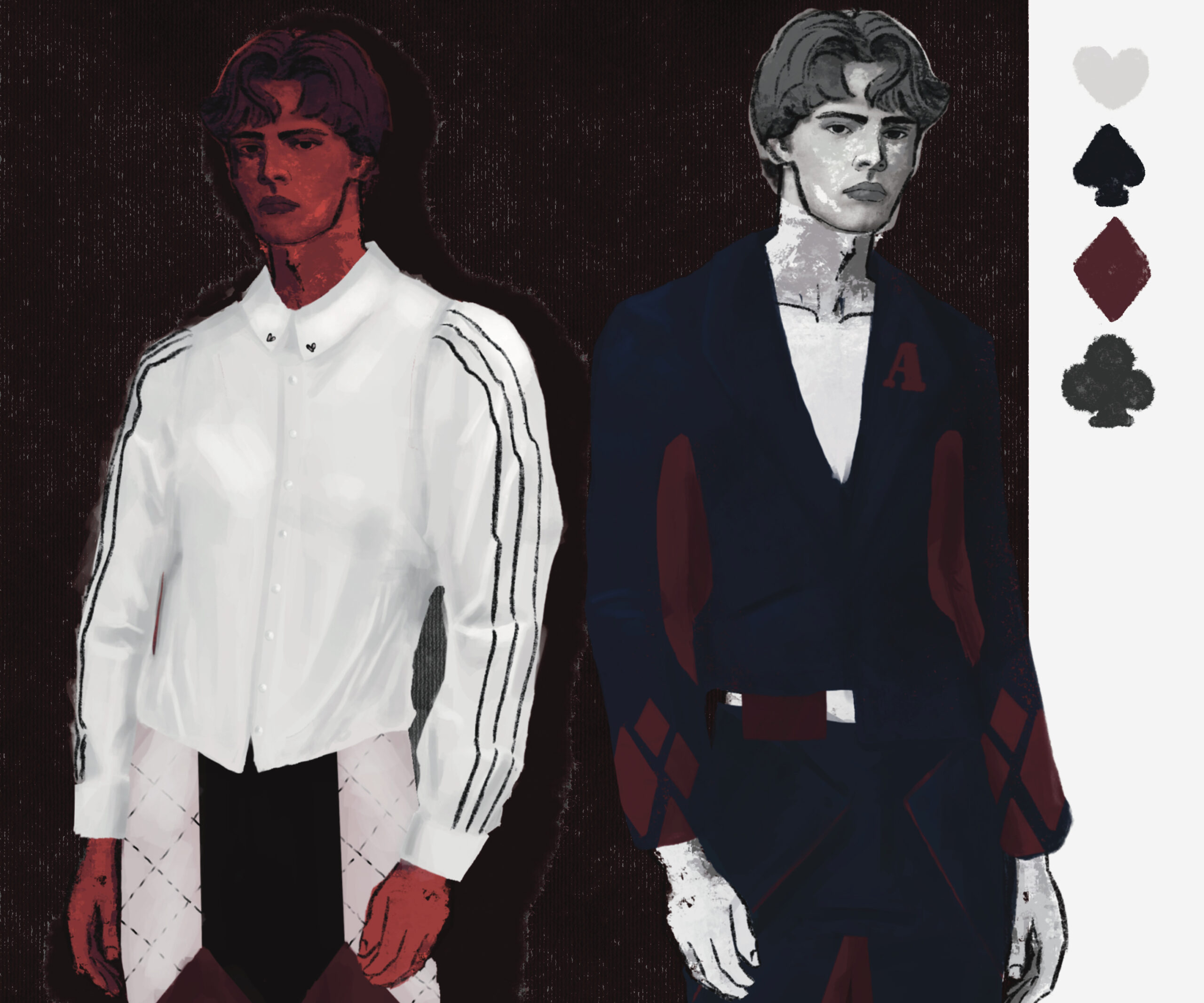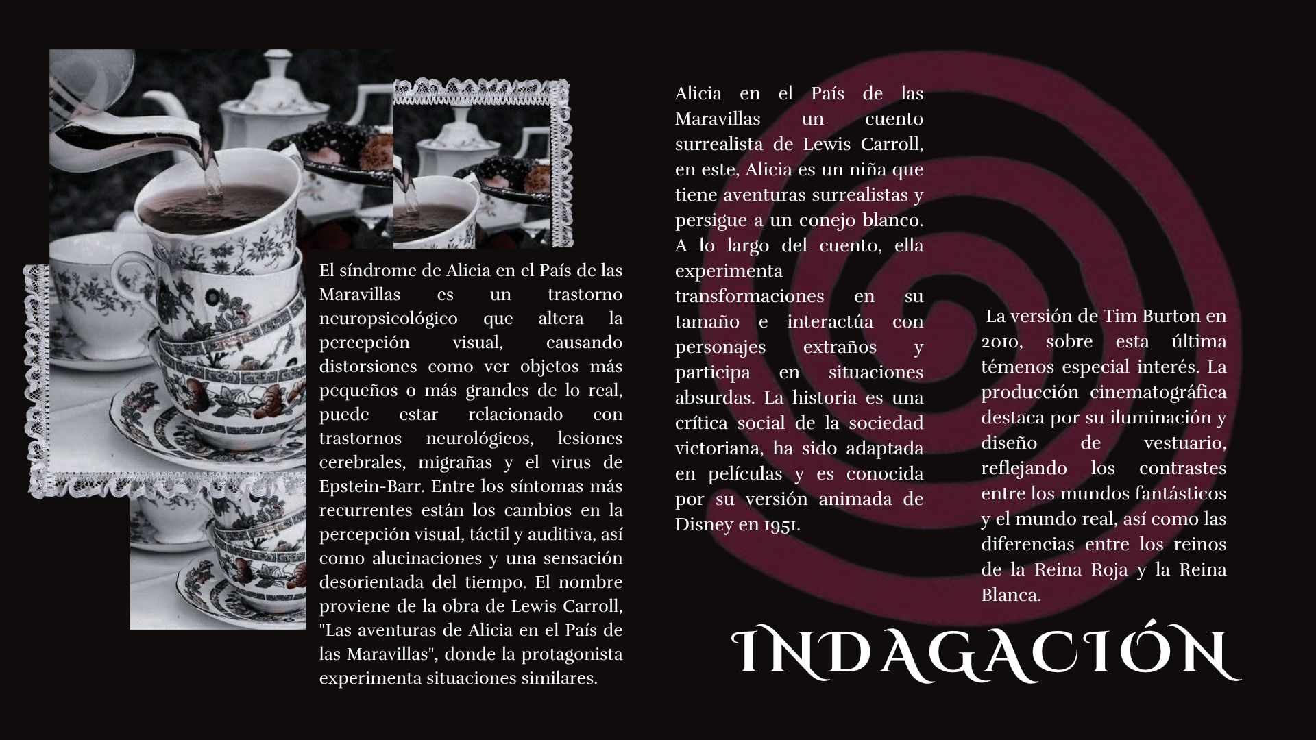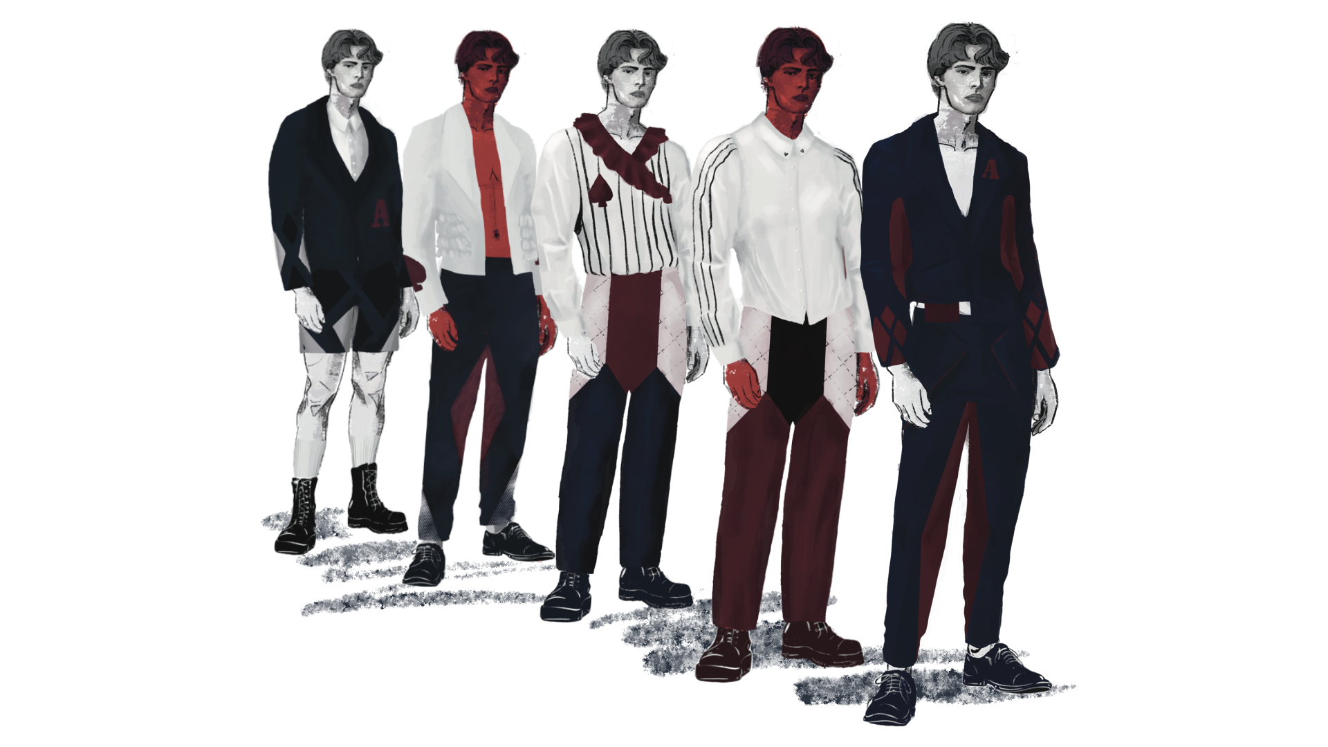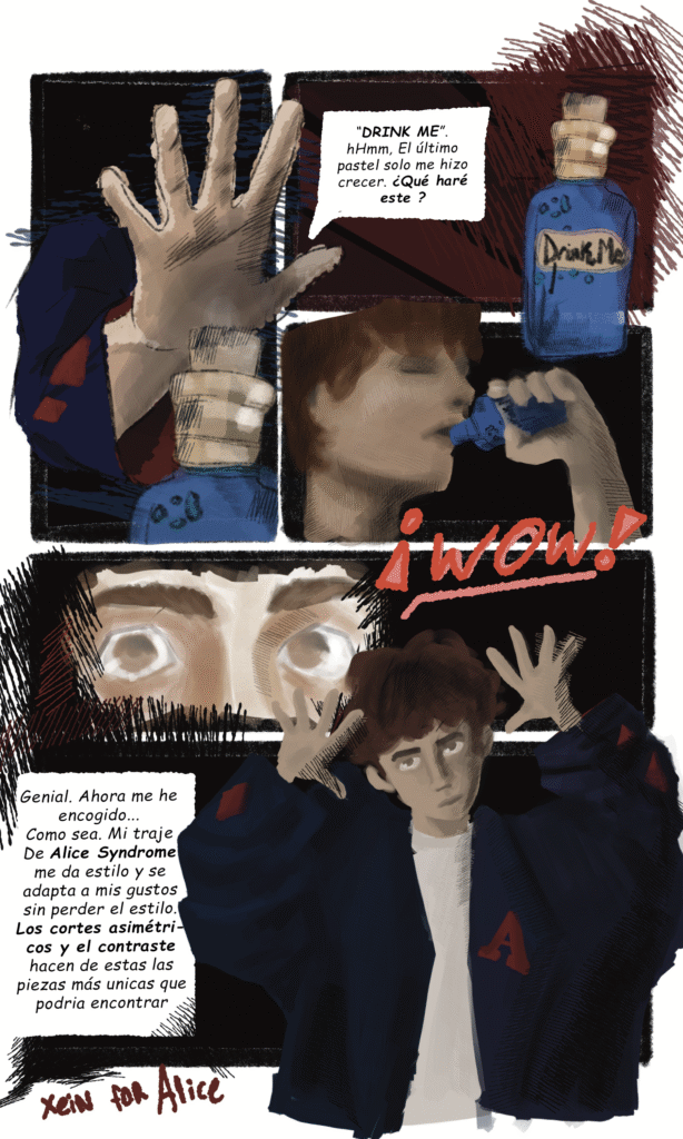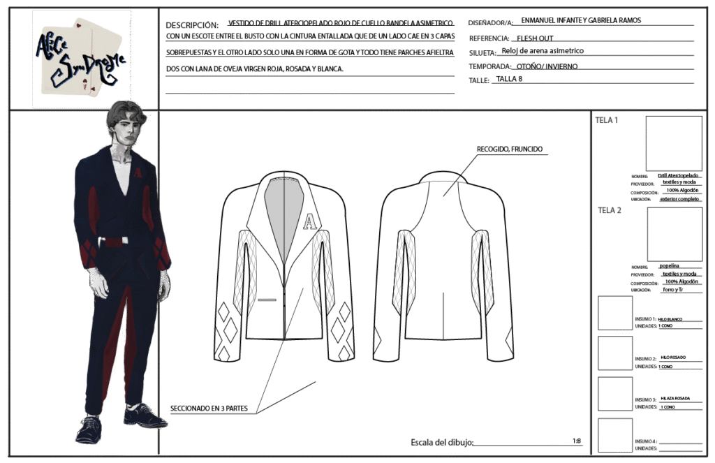 El Síndrome de Alicia, visto desde sus adaptaciones cinematográficas, se presenta como una distorsión de la realidad, donde se juega con asimetrías y siluetas rectas. Esta colección propone una estética gótica, circense y moderna. La combinación de estos elementos de diseño de trajes sastre crea un mundo surrealista que refleja la atmósfera y la esencia de Alicia en el país de las maravillas, acompañado por una paleta de color azul y roja que intensifica su carácter psicodélico y teatral.