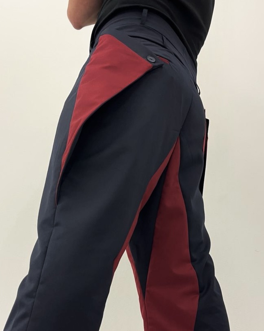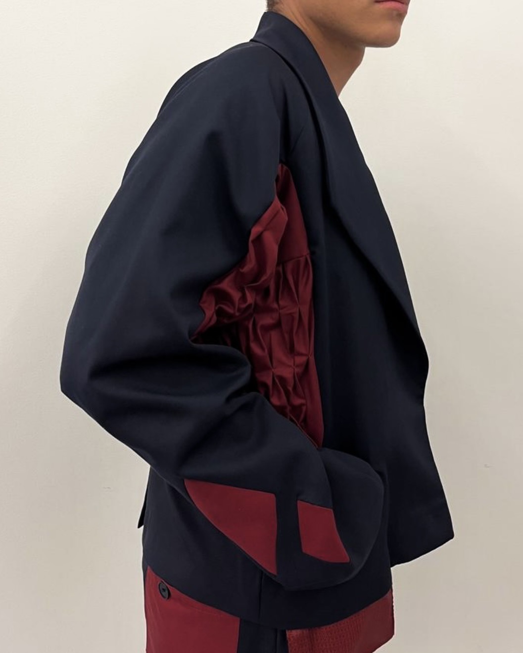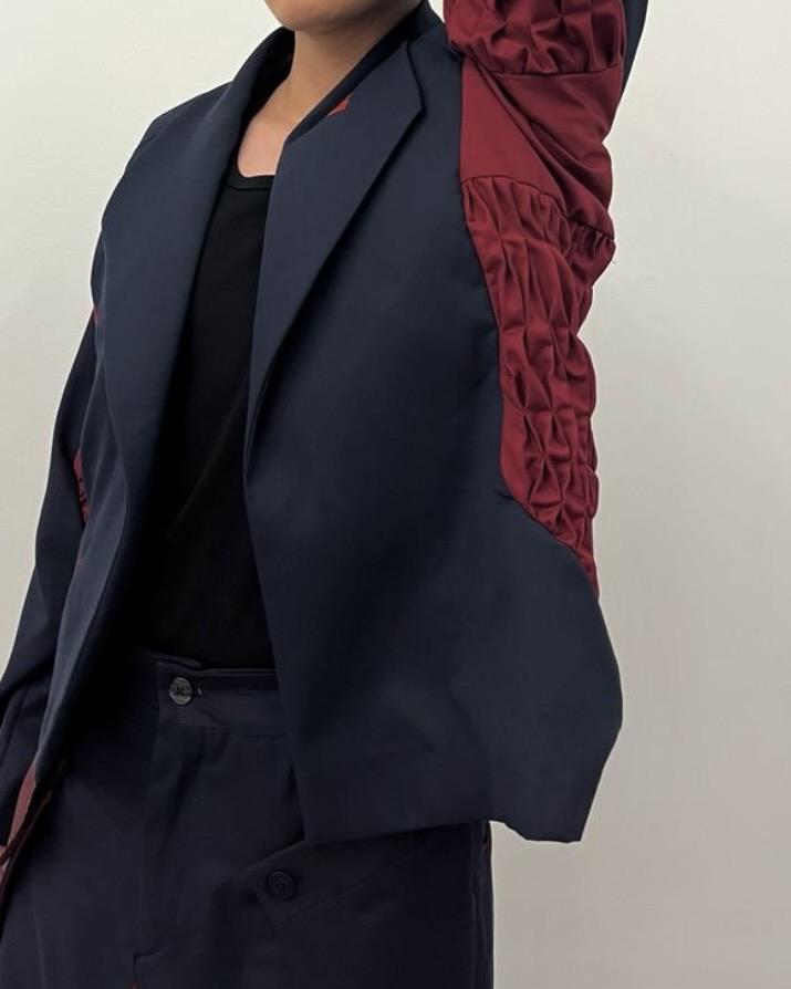 Usando este contraste de colores en gabardina, crear cortes y contrastes interesantes alusivos a la temática. Además, se busca lograr un capitoné pensado para las mangas y otros detalles, como un escudete para el pantalón.