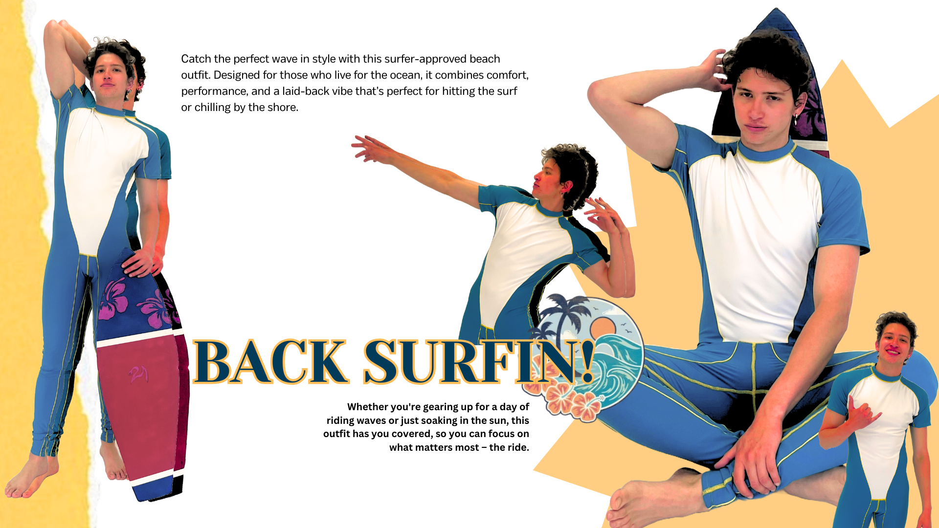 Esta colección es para todos los que viven entre olas: Nuestra colección está pensada para surfistas semiprofesionales que buscan rendimiento sin dejar de lado el estilo. Diseñamos trajes y prendas con una estética azul-amarilla que rescata la energía de los 2000s, creando un puente entre la técnica y la nostalgia. Te invitamos a descubrir el proyecto y dejarte llevar por la ola!